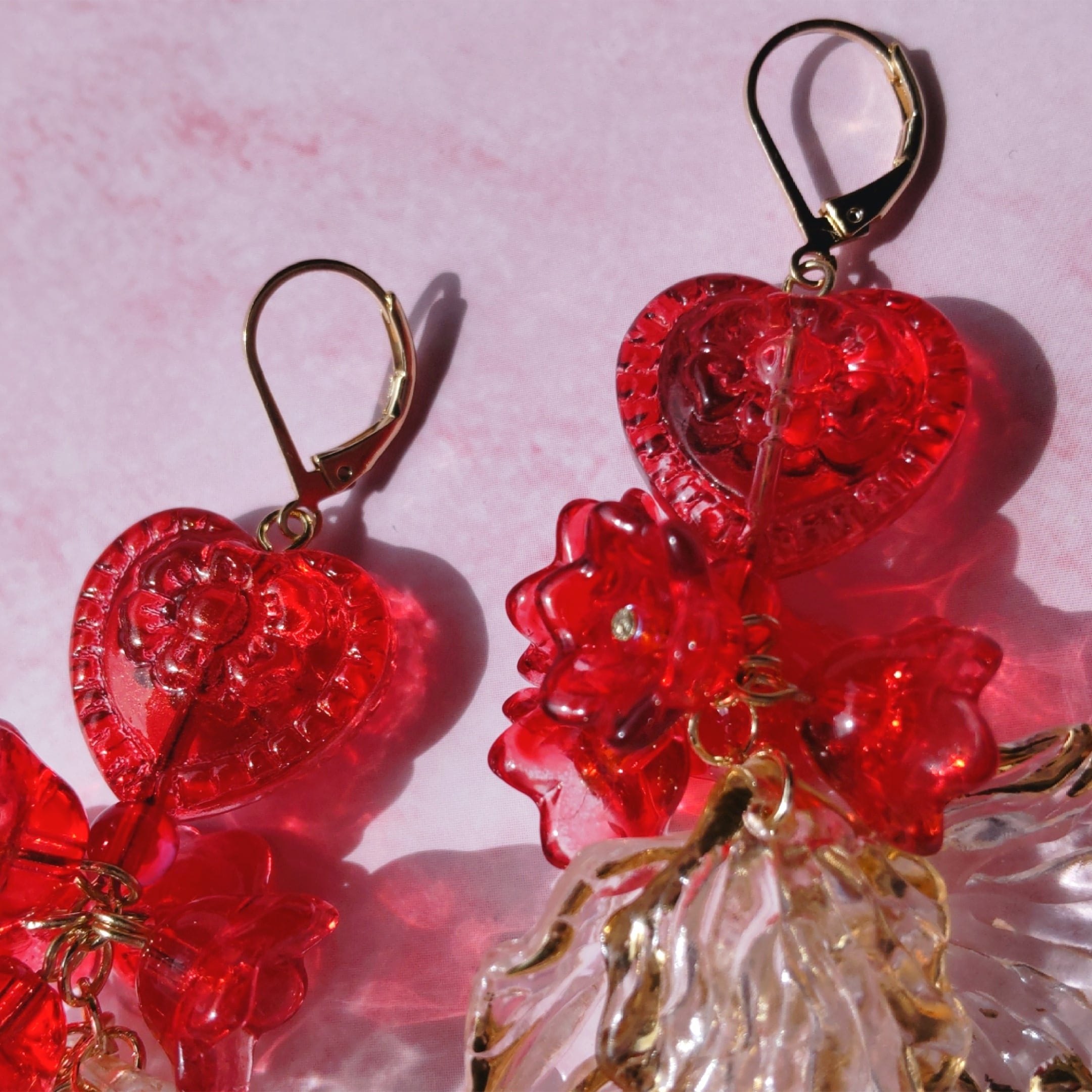 クリアレッドが情熱的で印象的なハートと、同じ色の小花たちに、貝殻や花びらのようなクリアカラー&ゴールドのパーツがドレスのように広がります。