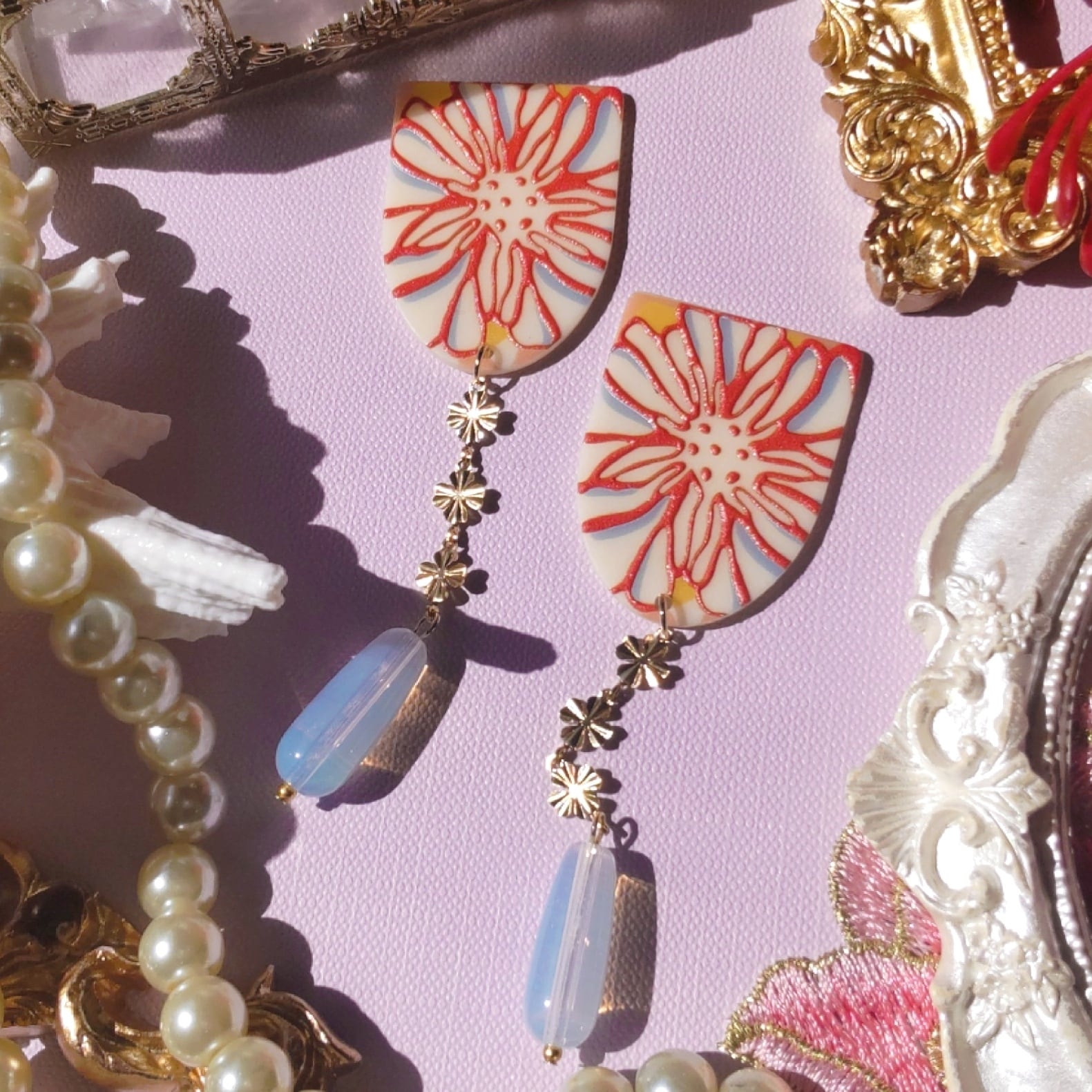 トップパーツはアイボリーにレッド、淡いブルーとイエローのダイナミックな花柄のプレート。光を反射するメタルチェーンの小花に、太陽を透かすような反射光のドロップパーツが揺れます。