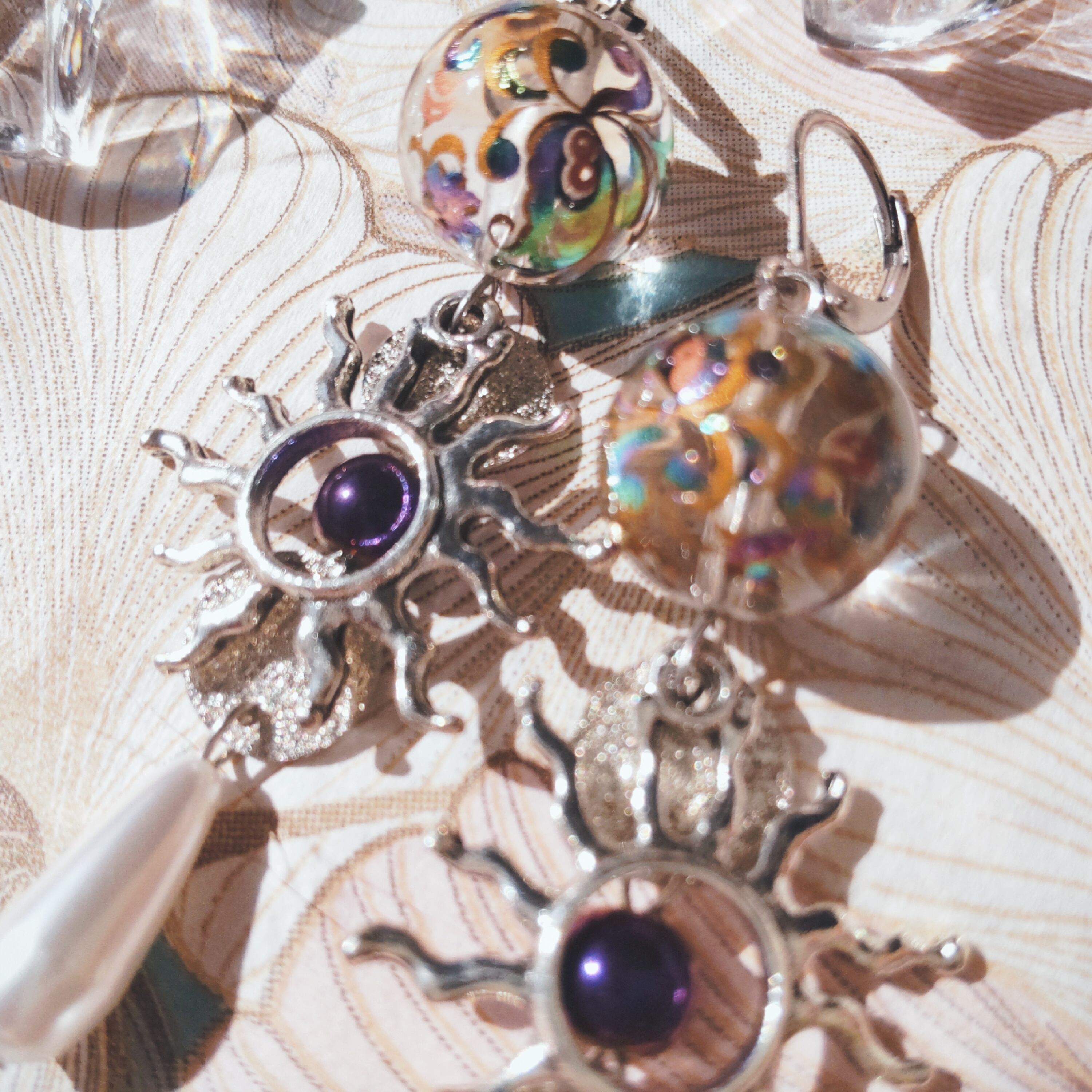 太陽モチーフと重なる紫のパーツはメタリックな質感です。個体や角度によって微妙に色が変わります。