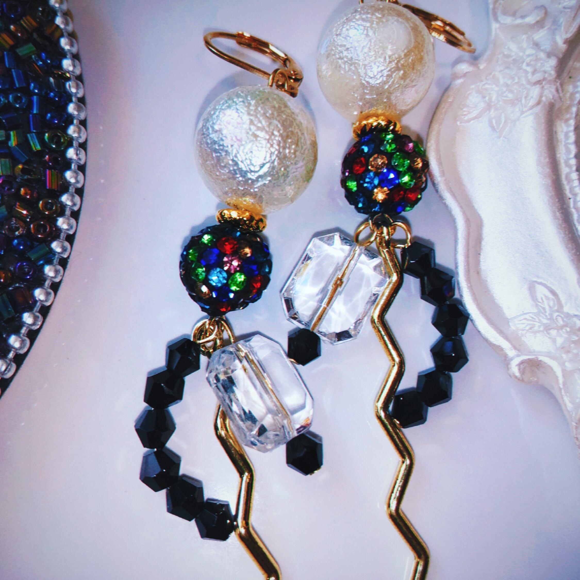トップのアクリルパールはオーロラ偏光、その下のパーツはブラックにカラフルなビジューがたっぷり輝いていて都会のネオンのよう。