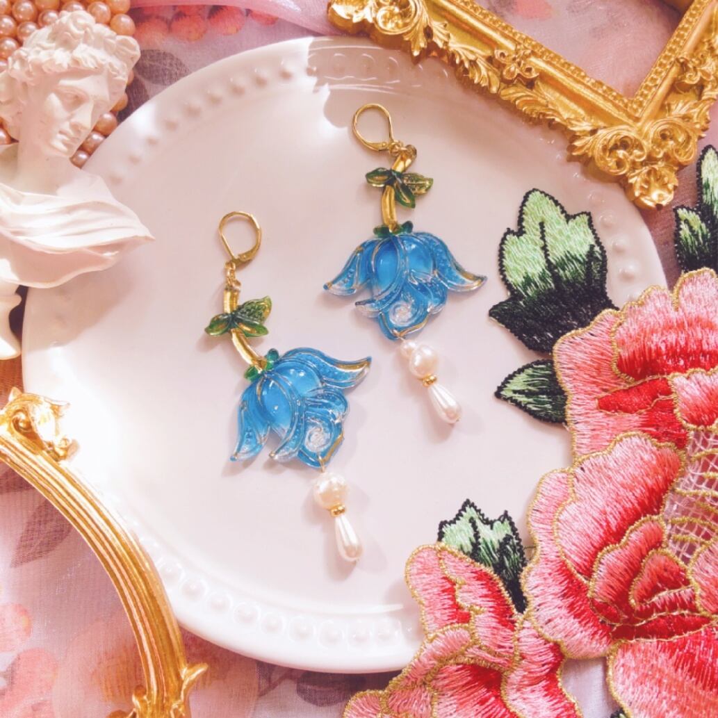 ネオンのように縁が反射するアクリルのお花はシルエットも色も綺麗で華やか。下には花から雫が零れるようにパールが揺れます。