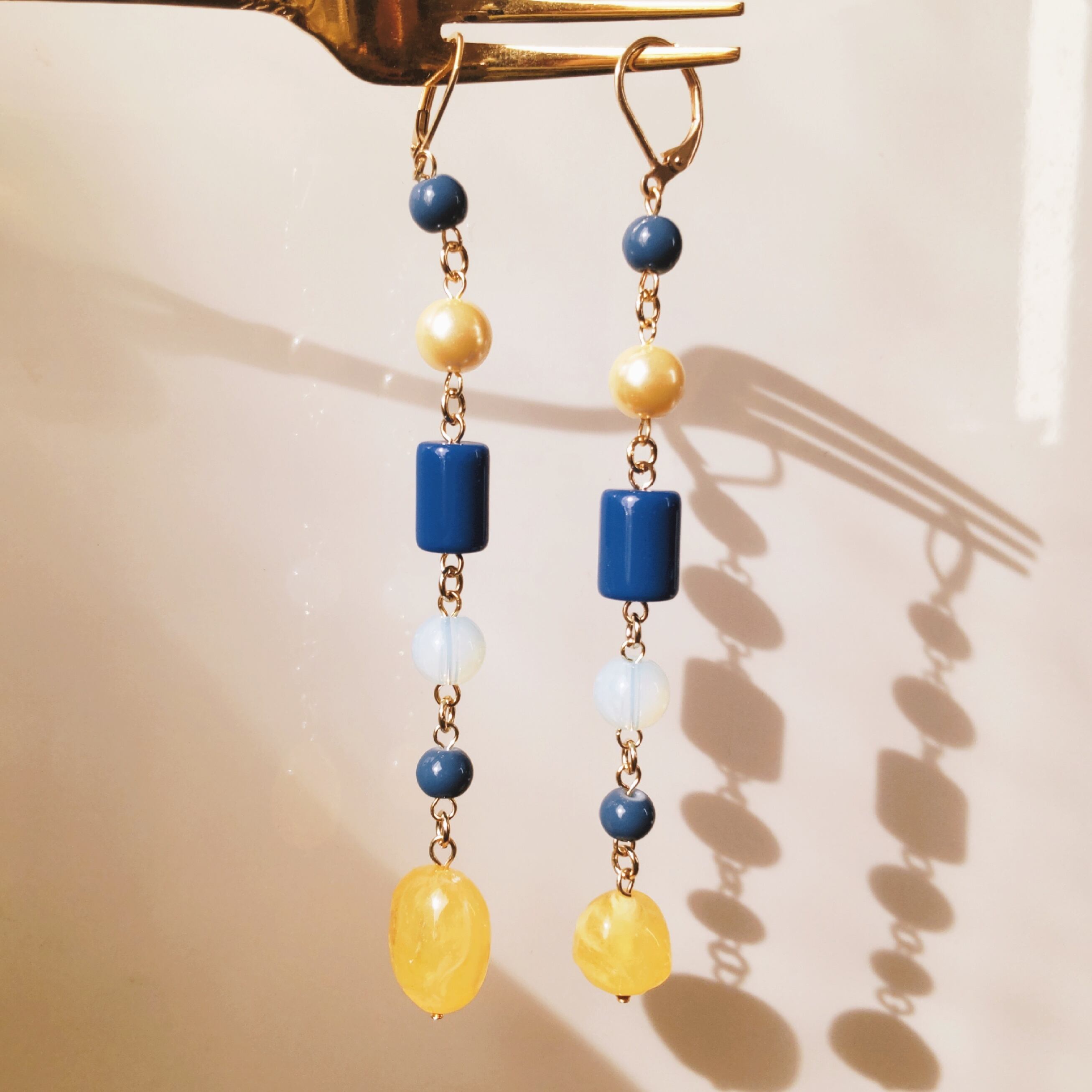光が灯ったような温かみのあるイエローとマットな青のコントラストが綺麗です。一番下の不揃いなイエローのパーツはヴィンテージ。