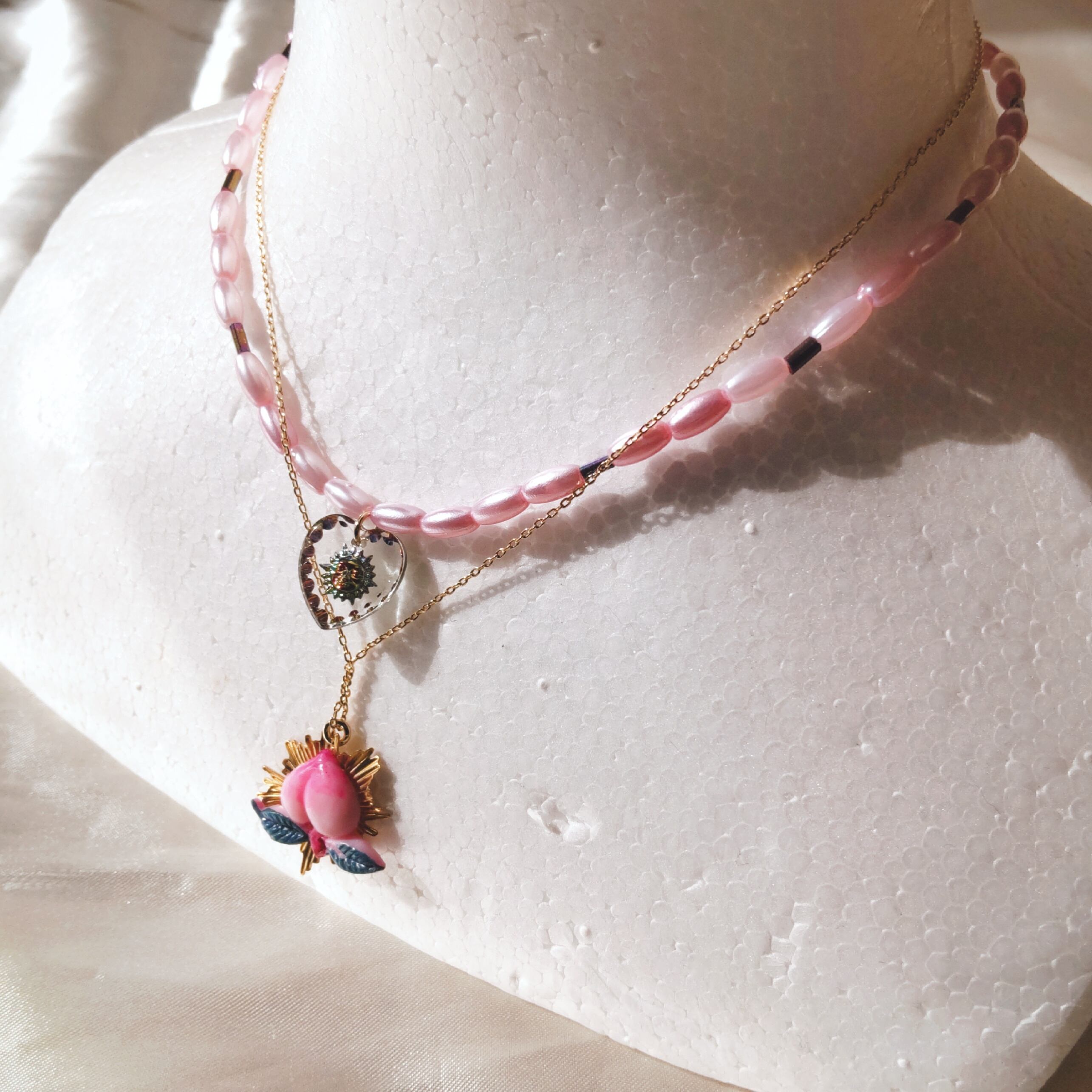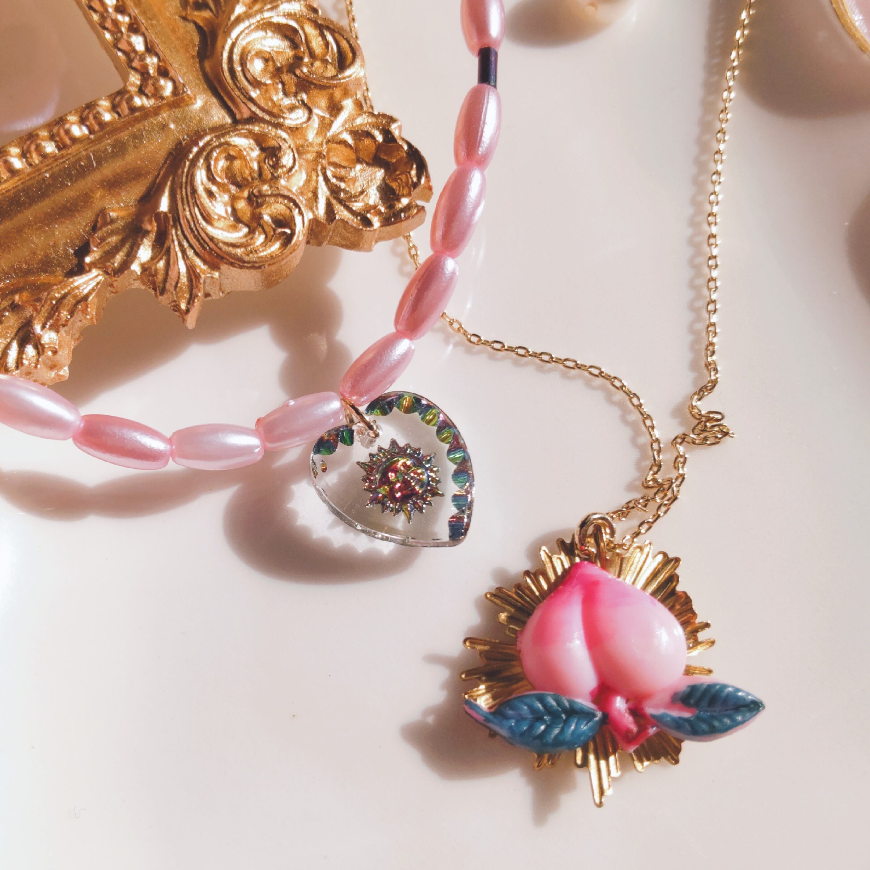 ハートのインタリオのピンクビーズネックレスと桃のチャームのネックレスのセット。