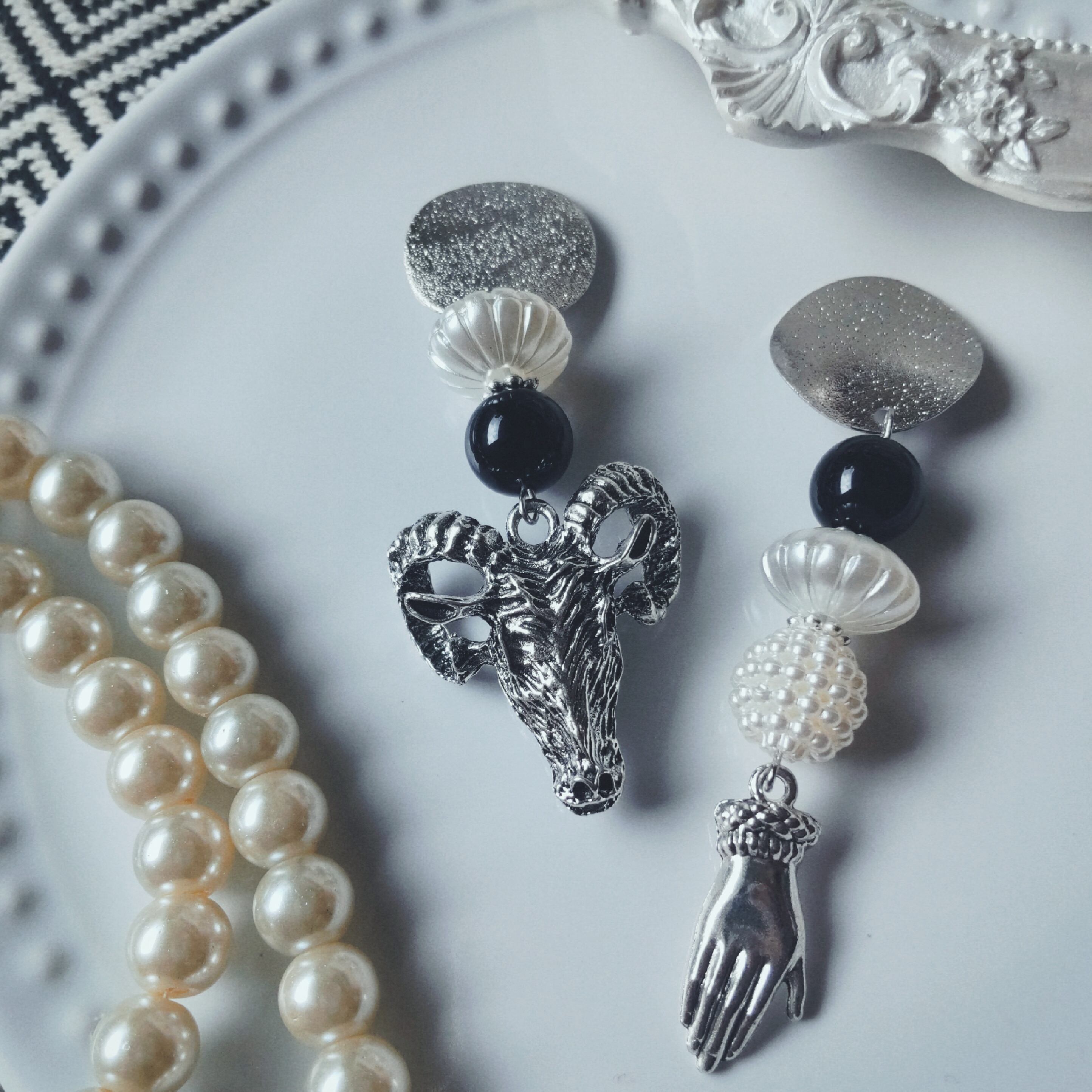 存在感のある山羊とパールのアシンメトリーな耳飾り。