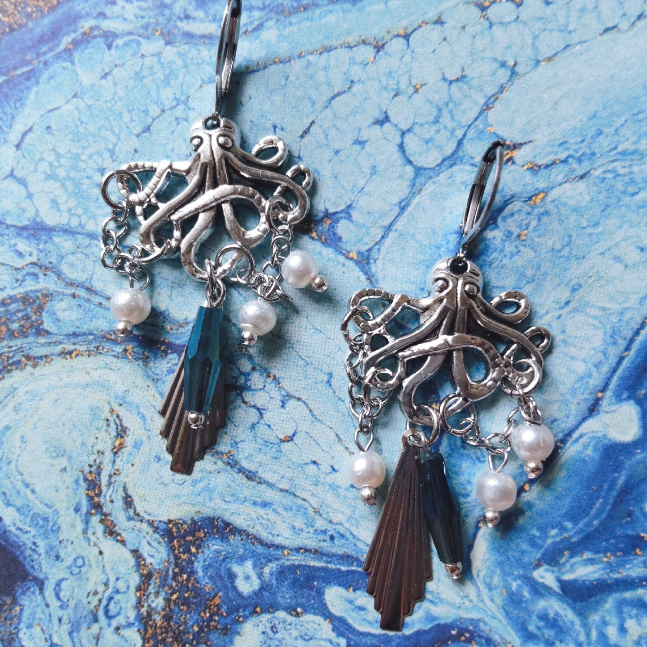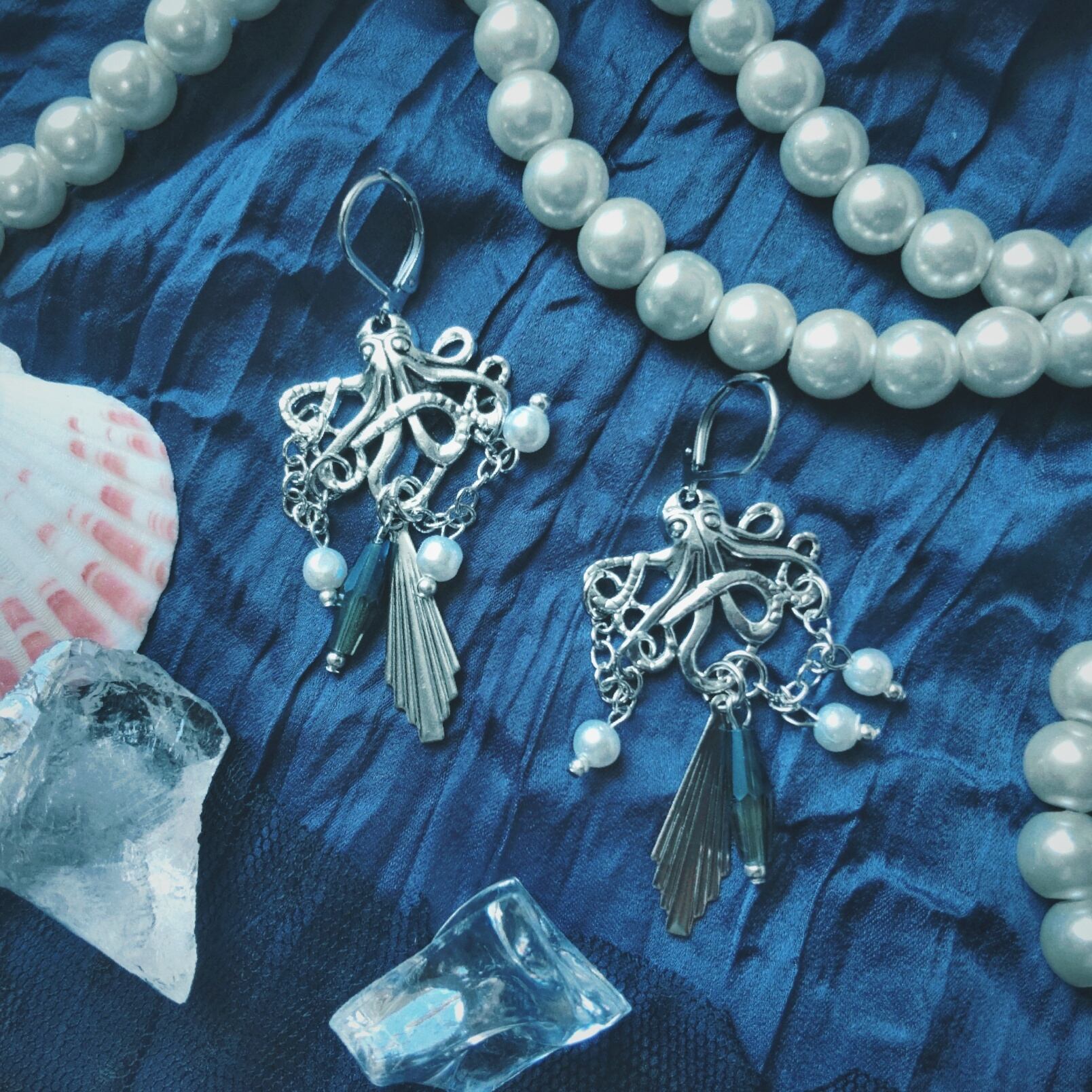 クールな蛸のチャームにチェーンと泡のような小粒のパール、深い海の色のメタリックパーツが揺れます。