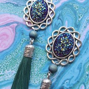 トップパーツは深い青からブルーグリーン、反射する光のようなイエローやオレンジが粒状に輝きます。タッセルはさらさらとした質感で、くすみ感のあるブルーグリーンが綺麗です。