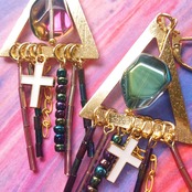 三角パーツの真ん中のパーツはグリーン&パープルをベースにメタリックな偏光を感じます。下に揺れるビーズもメタリックだったりパープルな偏光が独特の存在感があり綺麗です。