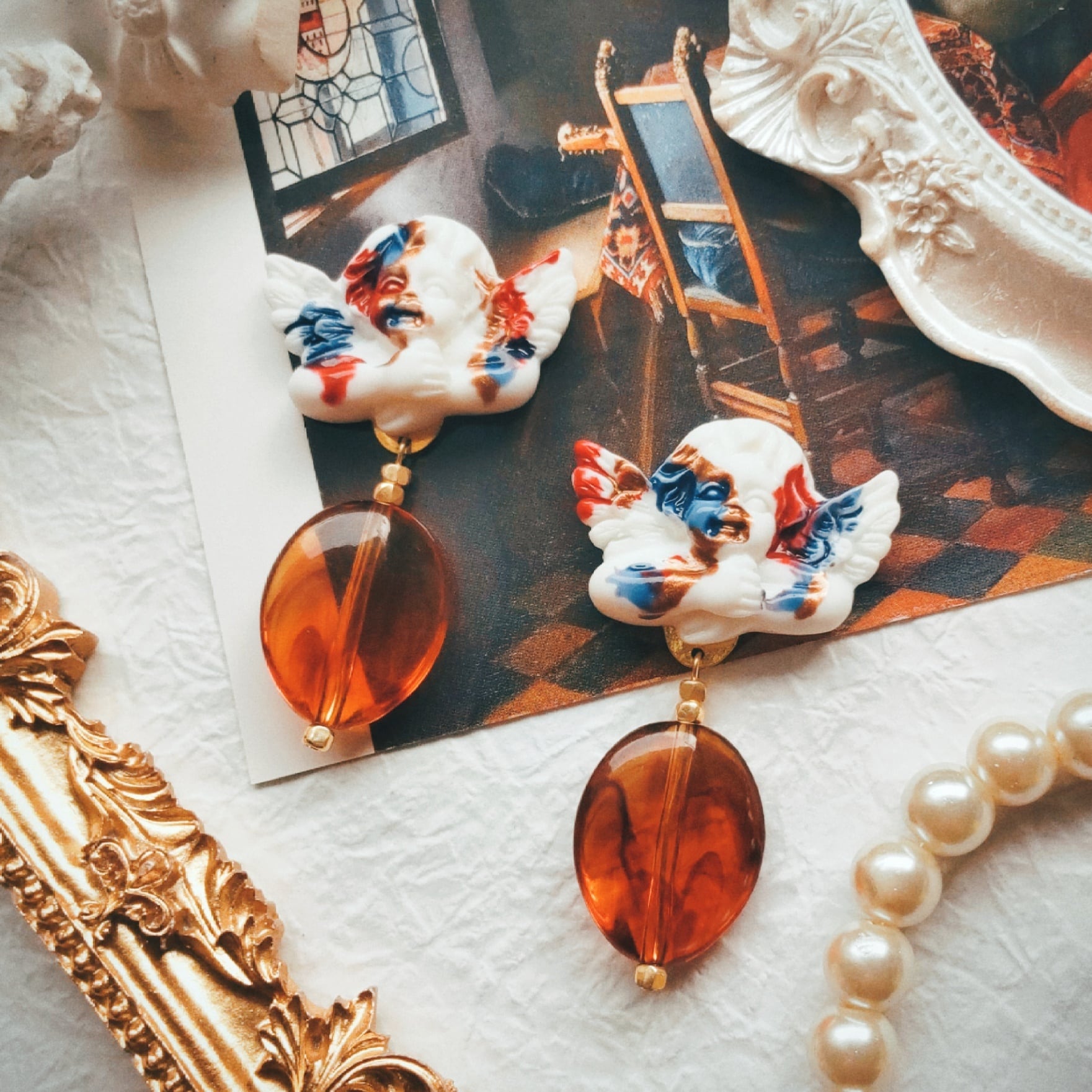 彫刻のような天使にべっこうの揺れる耳飾り。