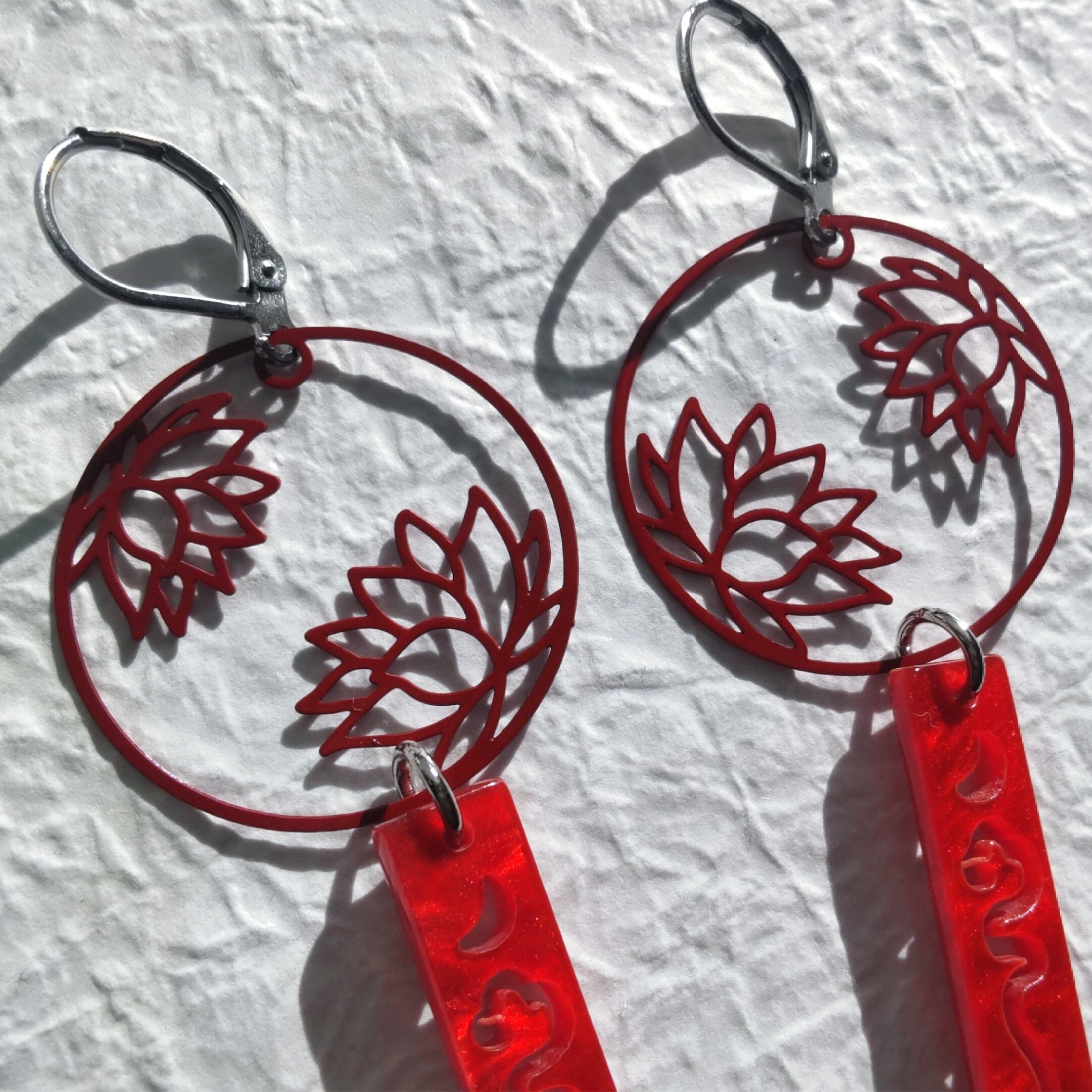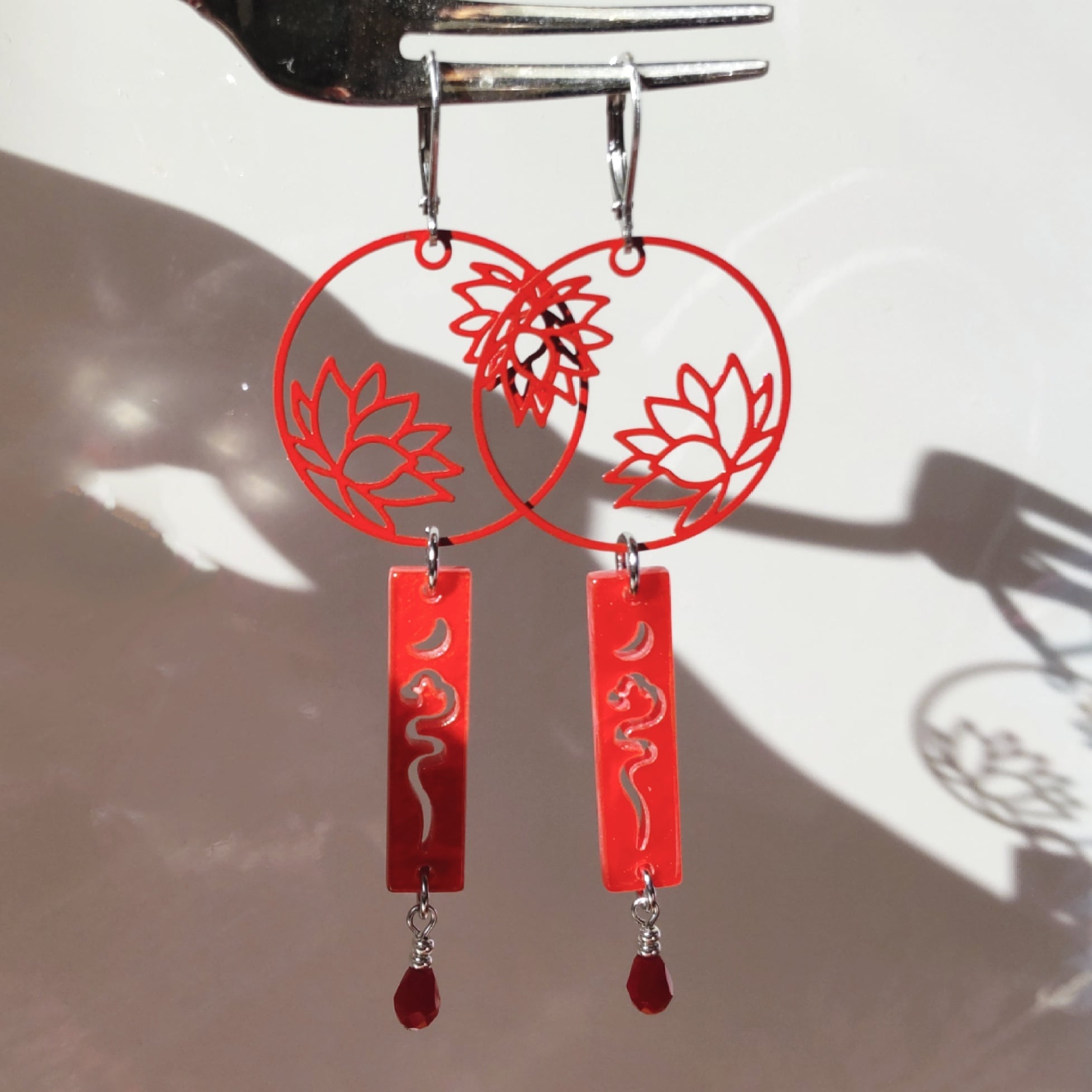 上品な透かしの蓮にシルキーな質感の月と蛇のスクエアプレートが揺れます。ワントーンの真紅は明るすぎず暗すぎずの魅入るような色合いで、お顔周りを美しく彩ります。