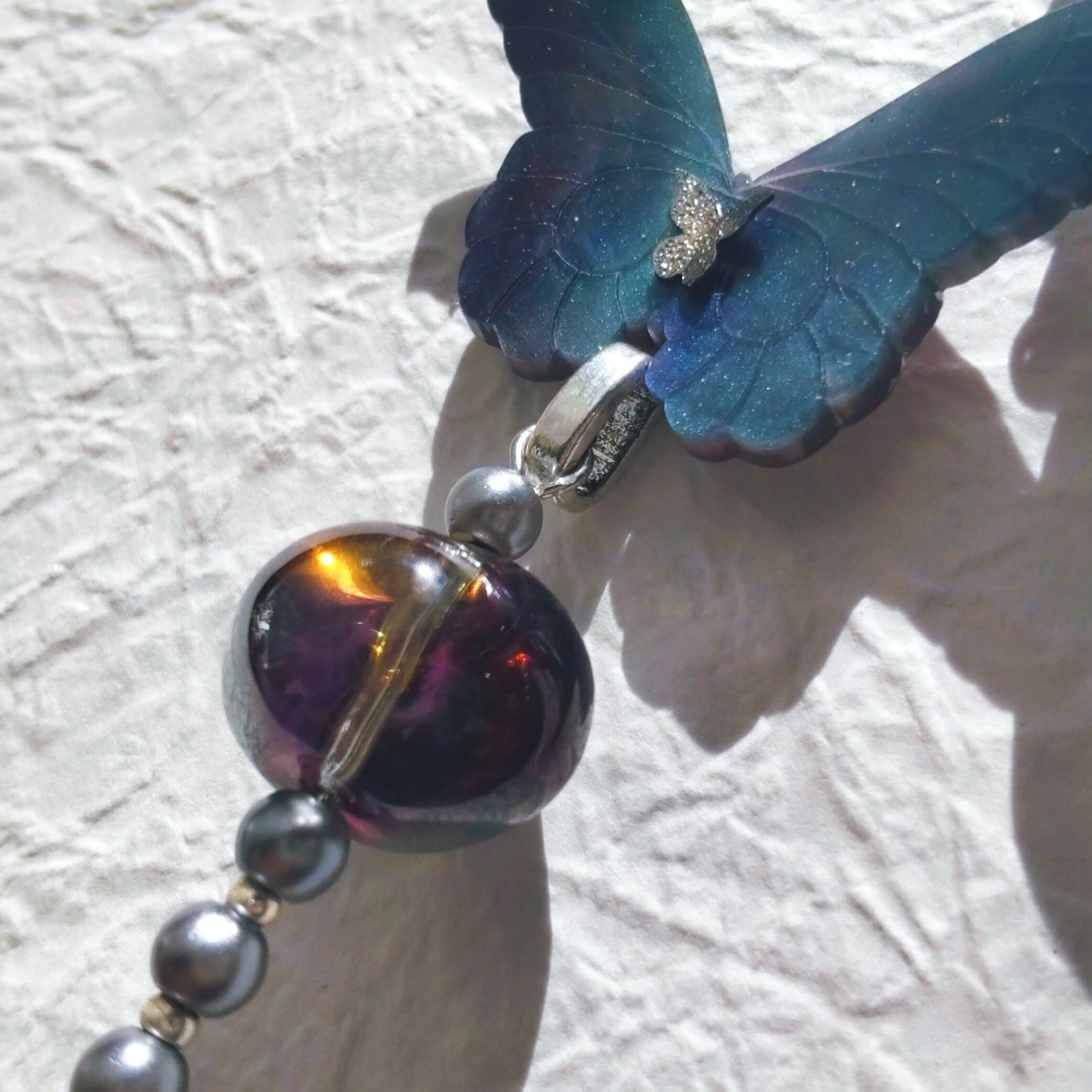 トップの蝶はブラックベースにブルーとパープルの輝きが思わず魅入ってしまうほどの美しさです。下にはシルバーのパールとメタリックで不思議な色合いのパーツが揺れます。