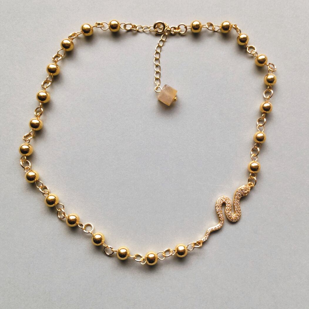 メタルプレートに綺麗な蛇のデザインのチャームネックレス、赤と青とゴールドのビーズネックレス、メタルボールに細やかなビジューの蛇が輝くネックレスが3連になっています。ビーズネックレスの青はすべてラピスラズリです。